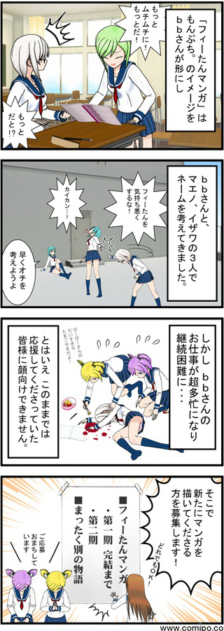 「フィーたん4コマ」はこれまで、moeyo.com イザワ&マエノ、bbさんの3人でネーム(原作)を出し合い、bbさんが作画するという形で連載を続けてきました。