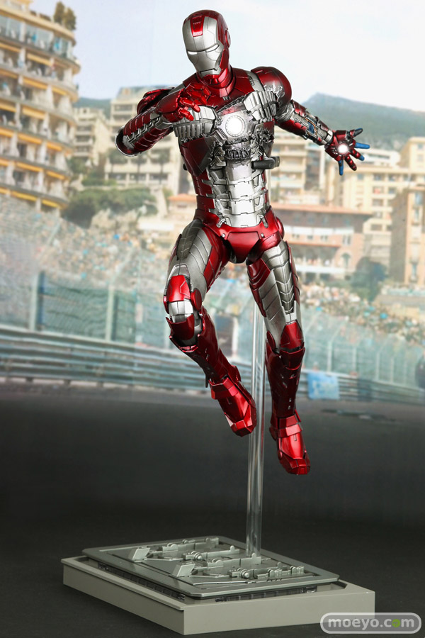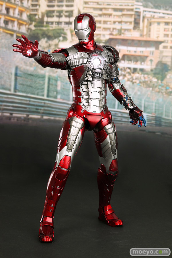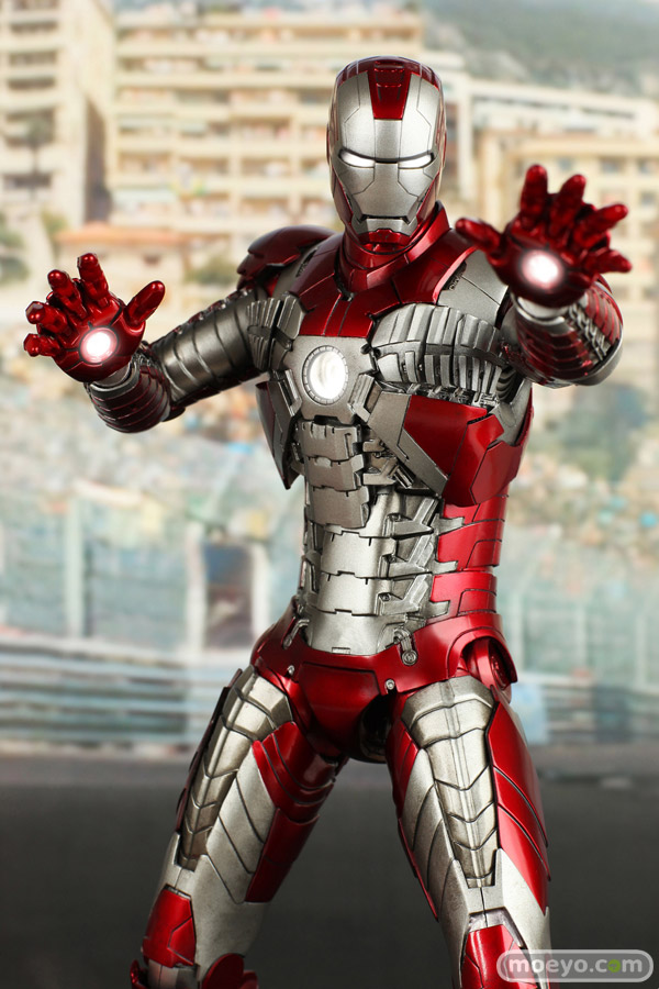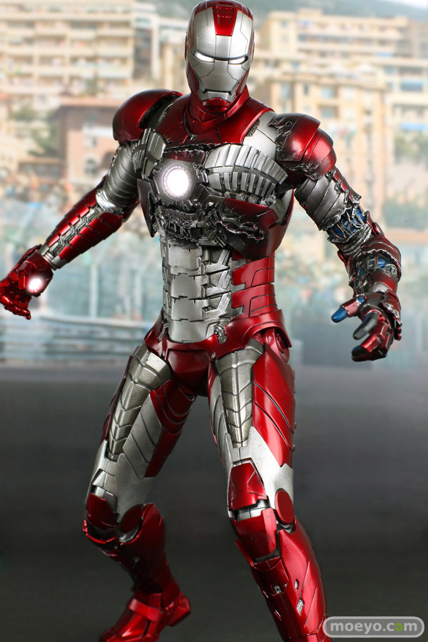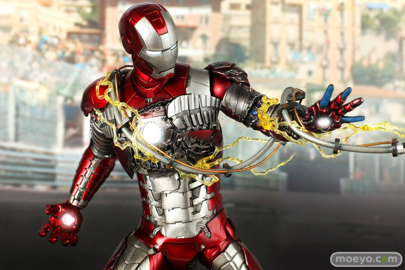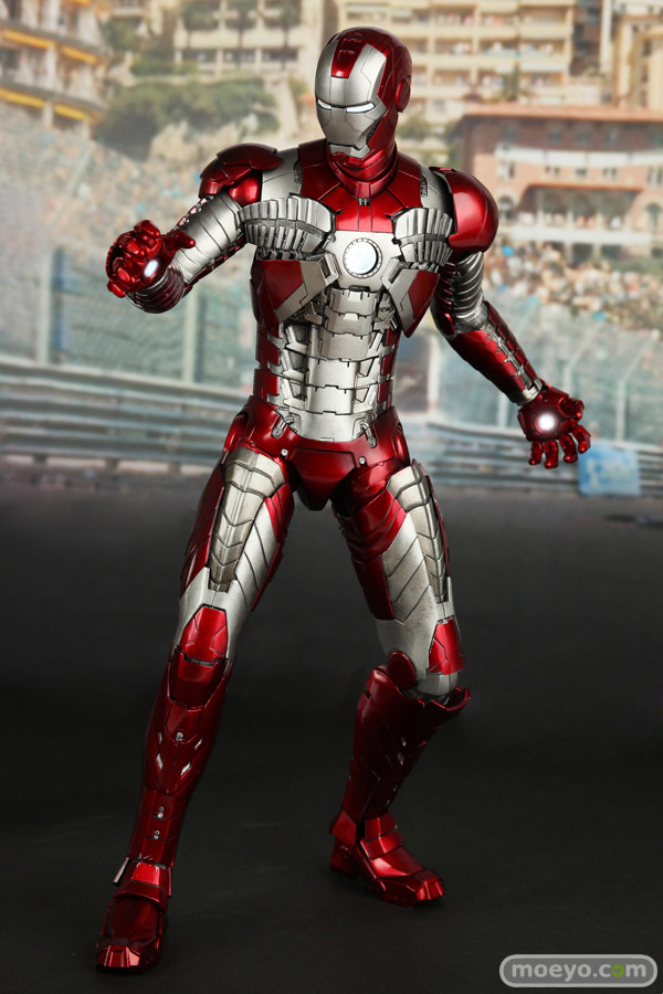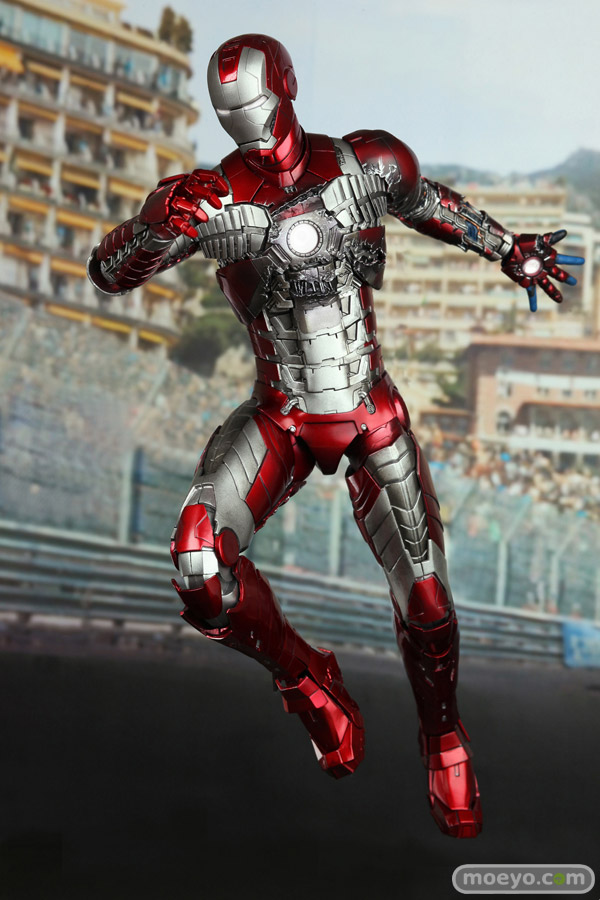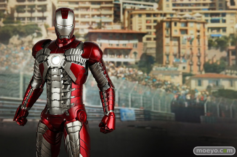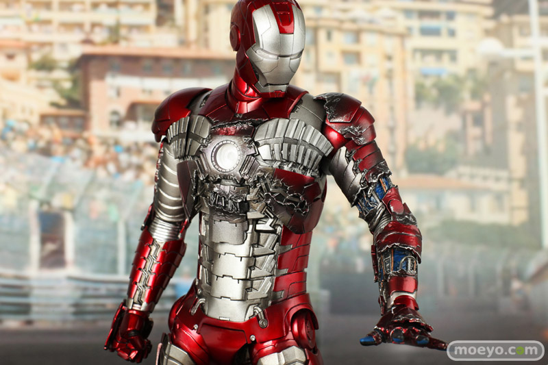 メタリックレッドとシルバーのカラーリングで、蛇腹のようなアーマーが特徴的なマーク5。モナコの市街地サーキットで宿敵ウィップラッシュに襲われた際には、その抜群の携帯性と凄まじいパワーでスタークの命を救う。