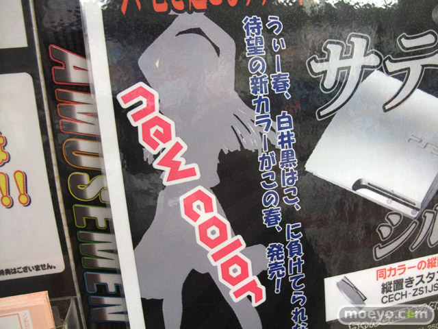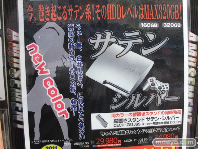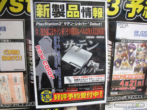 2011年3月10日に「PlayStation 3 サテン・シルバー」が発売されます。ソフマップAM館では『今、巻き起こるサテン系!』『うぃー春、白井黒はこ、に負けてられない』等とし、不思議と見覚えのあるシルエットが描かれたPOPが掲示されてました。
