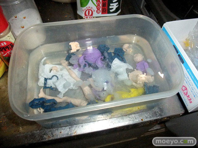 カラーレジンで塗装不要なので、初心者にも作りやすいガレキ「ダイすきット リペたん」を、もんぷち。が組み立てる過程を1日1枚の画像でお伝えしていきます!本日はガレキの離型剤を洗うために、パーツをイン・ザ・ポリデント。