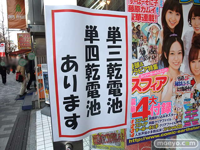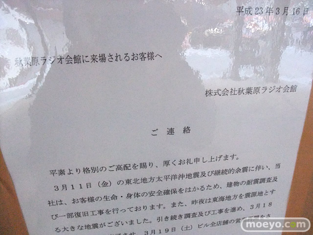 3月16日、ラジオ会館に新たな張り紙が掲示されました。それによると「3月19日(土)ビル全店舗の営業再開をさせて頂きます。」とのこと。他、ホビーシティ流防災グッズとか、意外な所に乾電池入荷等、3月16日のアキバの様子をざっくりと。