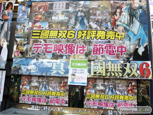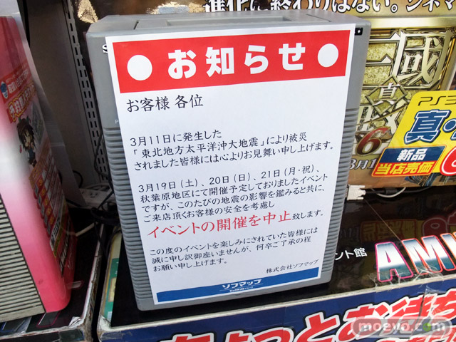 ソフマップアミューズメント館店頭のモニターは、中央の3つをのぞき節電のためOFFとなっていますが、そのモニターの上にPOPをつけていました。他、開店店舗がいくつか増加していたりした、18日のアキバの様子をちょっとだけ。