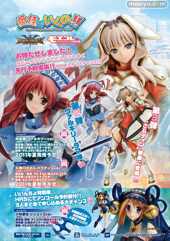 ■ 商品名:「モエコレPLUS 久寿川ささら パラディンver.」 ■ 出典:「愛佳でいくの!!」 ■ 仕様:PVC塗装済完成品 ■ サイズ:1/8スケール ■ 原型制作:みさきせりか氏 ■ 受注価格: 通常版(特典なし)税込8,925円 特別版(特典あり)税込9,450円 ■ 受注期間:2011年4月3日 ホビーラウンド5にてイベント限定受注 ■ 発売時期:2011年夏予定 ■ 先行予約特典:B2サイズお風呂ポスター |