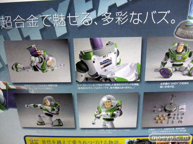 「トイ・ストーリー」からバズ・ライトイヤーが超合金で登場!「トイ・ストーリー3」で判明した電池BOXギミックも再現。キャノピーは90度の開閉が可能、フルオープン状態のキャノピーも交換用パーツとして付属。収納されたウイングは左右に展開可能。オリジナルの専用台座は3点アームで様々なポーズをアシスト。8つの交換用手首と、7つの交換用フェイスが付属。エンディングでのジェシーとのダンスシーンを再現する薔薇も付属。