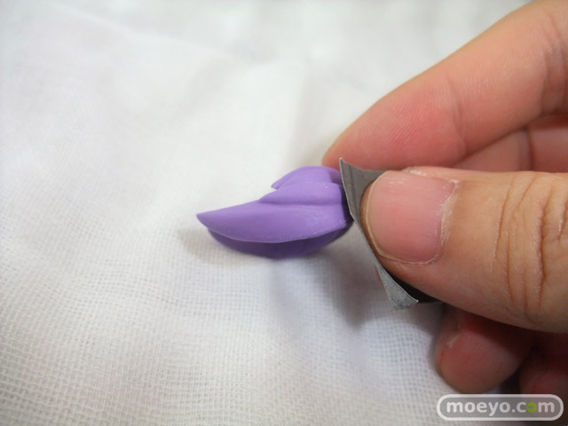 カラーレジンで塗装不要なので、初心者にも作りやすいガレキ「ダイすきット リペたん」を、もんぷち。が組み立てる過程を1日1枚の画像でお伝えしていきます!今日は前髪のサイドにあるバリを600番のヤスリで削り落とします。
