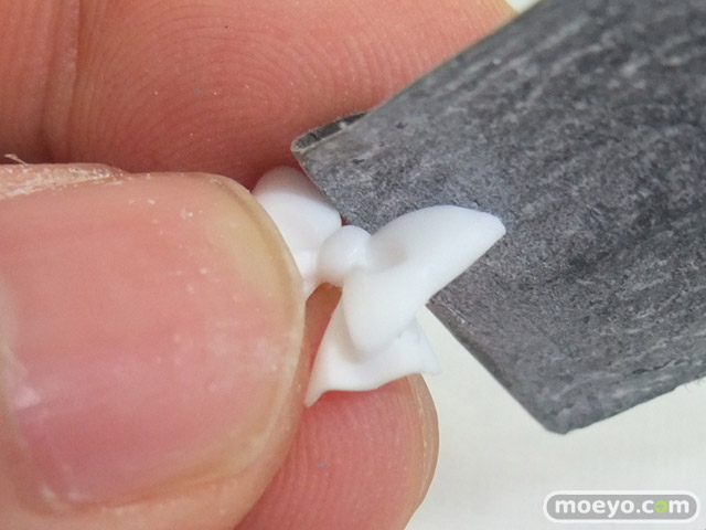 カラーレジンで塗装不要なので、初心者にも作りやすいガレキ「ダイすきット リペたん」を、もんぷち。が組み立てる過程を1日1枚の画像でお伝えしていきます!今日はリボンのバリをとった後、ヤスリがけで形を整えます。