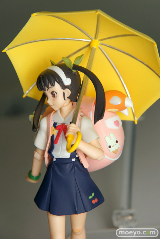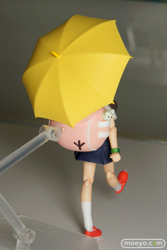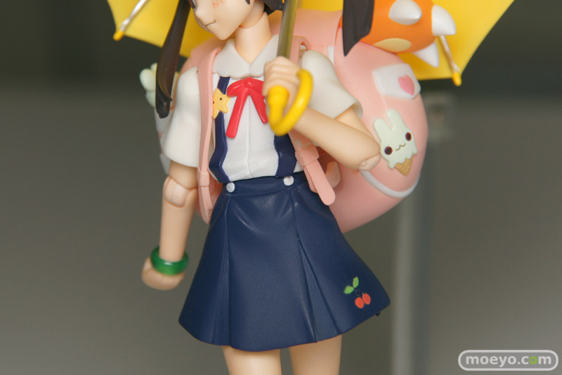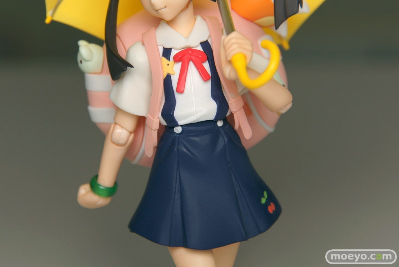 マックスファクトリー「figma 化物語 八九寺真宵」のサンプルレビューです。表情は2種の笑顔と怒り顔が付属し、開閉2種の黄色いカサ、大きなリュック等小道具も丁寧な仕上がり。初登場時の公園シーン再現用のおすわり用「shift body」も付属。