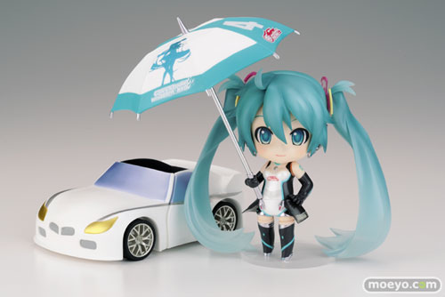 初音ミクGT カーをイメージしたねんどろいどカーや、今期参戦マシンのカラーリング(第1弾)を再現したデカール、表情替えパーツのテレ顔、サーキットには欠かせないパラソルなどが付属します。