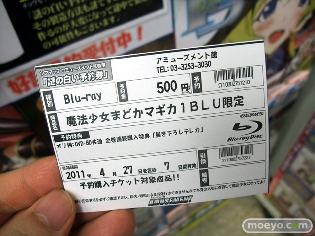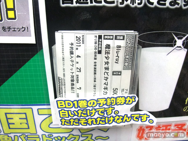 亀甲縛りPOPなど、仕事が速いソフマAM館1F予約コーナーで「謎の白い液体」ならぬ「謎の白い予約券」がBlu-ray「魔法少女まどか☆マギカ 1巻」の予約券として登場。勢いだけで作ったのか、POPには「何で用意しちゃったかも謎。」とも。