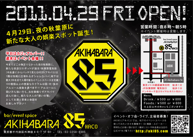 ■ Bar/Event Space『AKIHABARA85』 ■ 4/29(金)オープン 18時~翌朝5時 バー営業 ■ 5/4(水)オープン記念イベントAKIHABARA open the BOX! ■ (入場フリー)18時~24時 ■ 場所:東京都千代田区外神田4-6-7カンダエイトビル1F・B1 ■ Tel:03-3258-8885 ■ 公式HP:http://www.aki85.com/ ■ 通常営業時間:夜8時~朝5時※イベント時は変動する事があります。 |