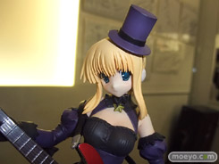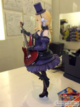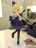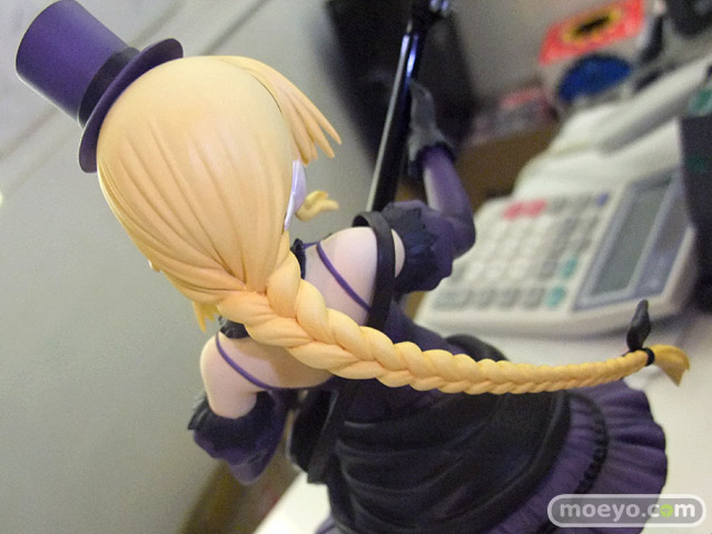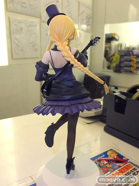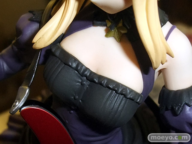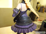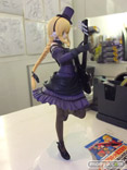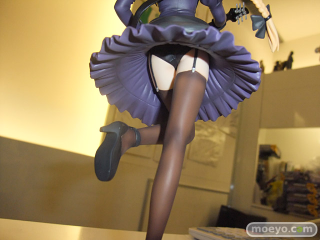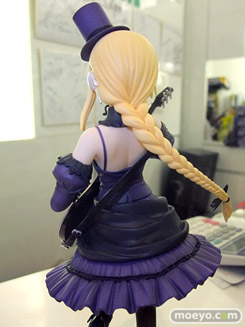 深い紫と黒を基調にしたゴシックドレスから覗く胸元や、大きく開いた背中、ストッキングを留めるガーターベルトなどにセクシーさを感じさせつつ、その中にも可愛らしさを演出する大小とりどりのフリルや首もとのチョーカー、ちょこんと載ったシルクハットカチューシャなどの既存イラストの再現はもちろん、キャラデザを担当したみつみ美里氏との打ち合わせにより、イラストが存在していなかった背面デザインや靴の構造などの細かい部分も立体化しました。