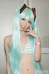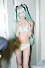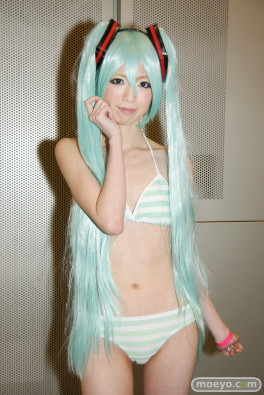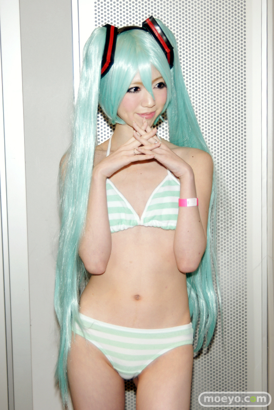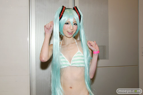 「コスホリック02」レポート012は、愛梨子(ありす)さんの「初音ミク」。縞パンまる見え・・・ではなく、ボーダー柄のビキニ、スイムウェアですよ!スラリとのびた手足に、おちゃめ機能とか搭載されていそうな笑顔が眩しい!あぁ夏は目前だね!
