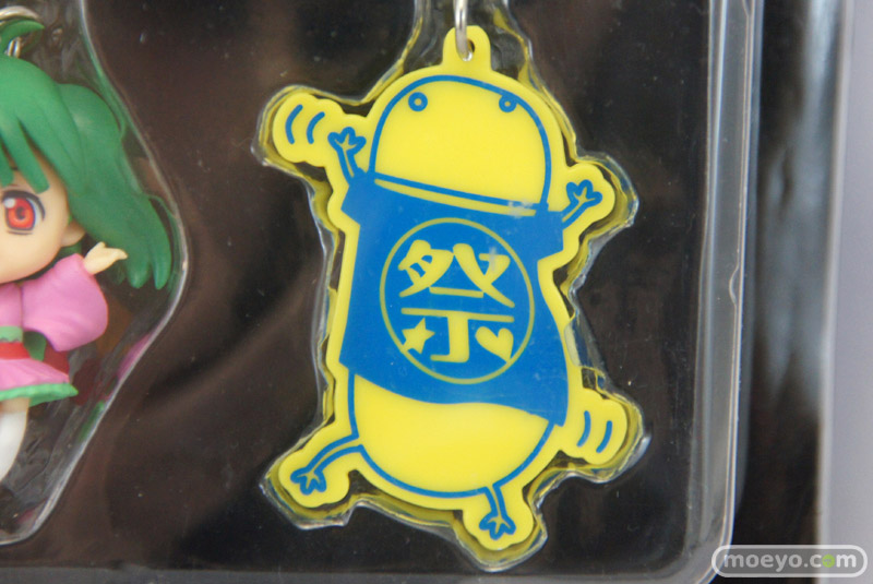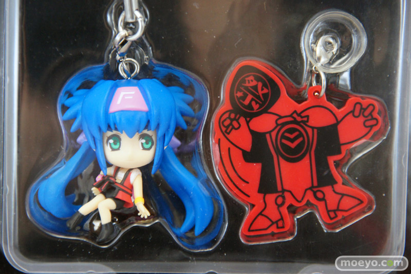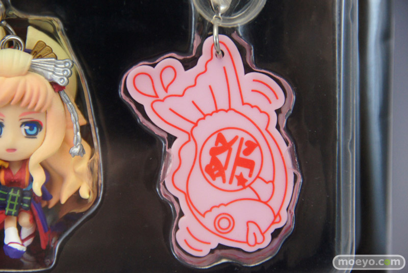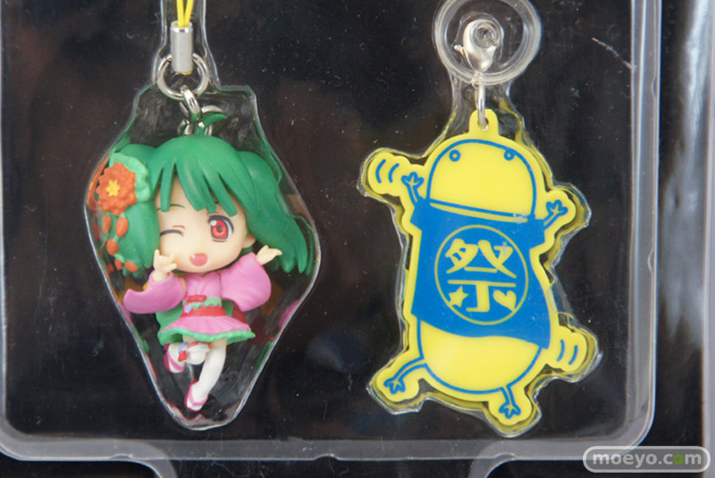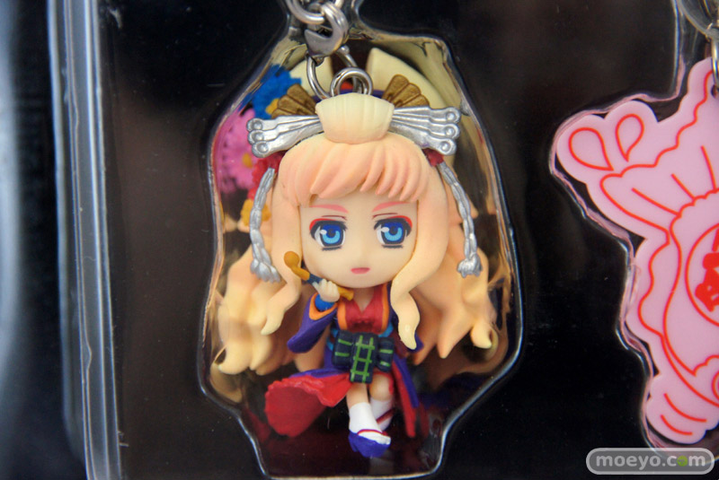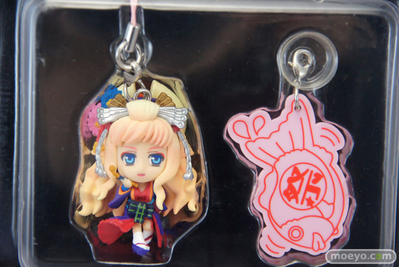 ミニサイズの花魁シェリル「きゅんキャラ」に、彼女愛用のタイヤキ型携帯のプレートがセットされたシェリルのストラップ。ランカはミニサイズの舞妓ランカの「きゅんキャラ」と、はっぴ姿のサンショウウオ型携帯プレートのセットです。新規にクラン・クランのストラップも加わりました。