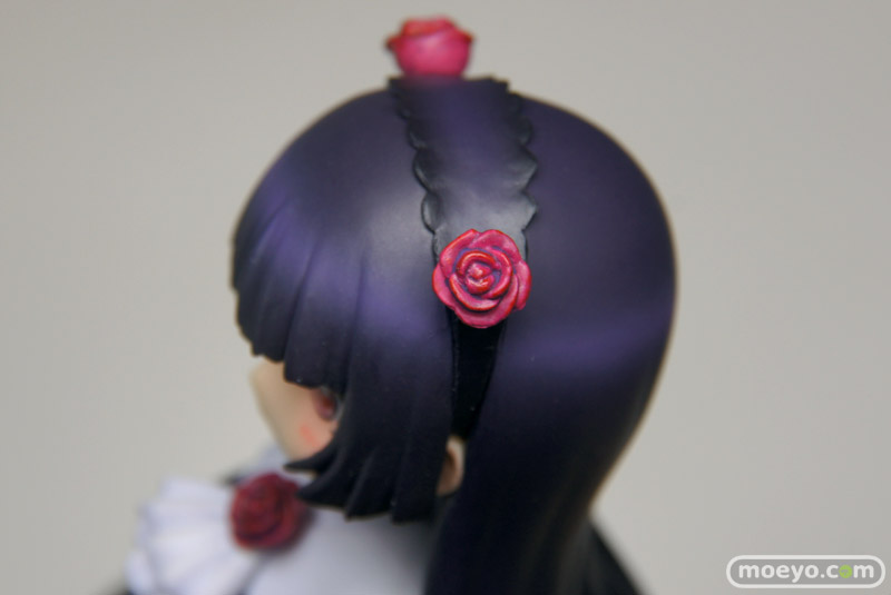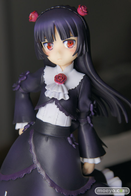 黒と白のシックな色合いながらも、ふんだんにあしらわれたフリルが華やかさを演出しています。表情は照れ屋の黒猫らしく、”ツン”としつつもちょっぴり頬を赤らめた瞬間を再現しました。特徴でもあるパッツンな髪型は、重くなりすぎないよう、細かな段差を入れることでサラサラ感を演出。後ろ髪の流れにも拘り、動きによる揺れもしっかりと表現。カチューシャの薔薇も可愛らしくつくりました。2月発売予定の元気いっぱいの「桐乃」に対し、可愛い雰囲気が際立つように制作しました。