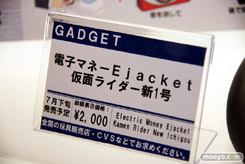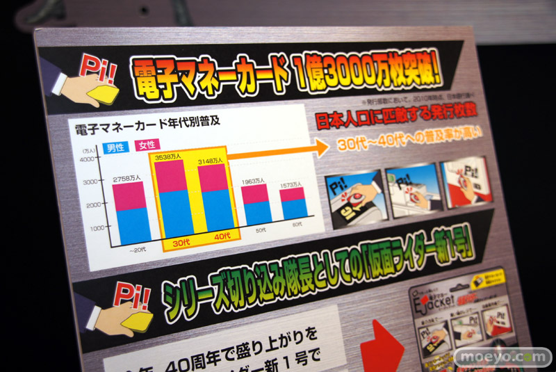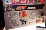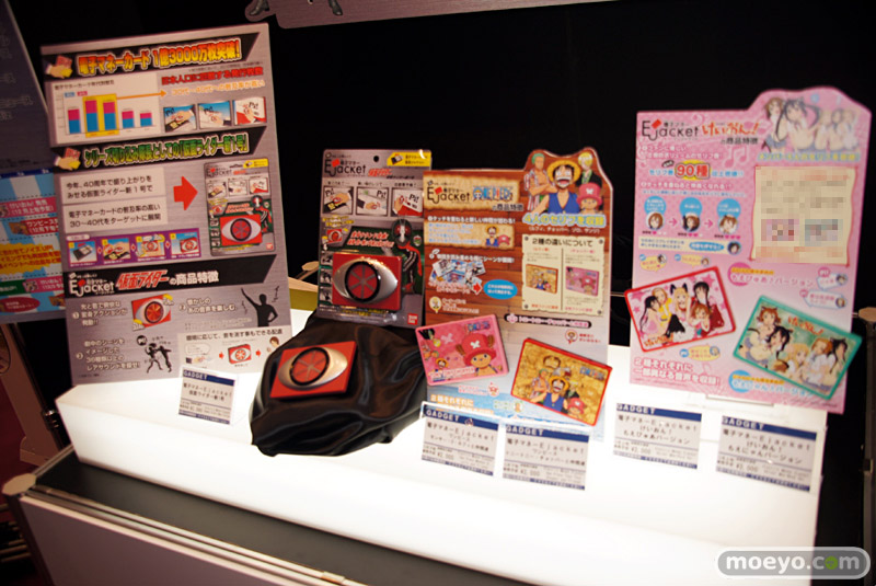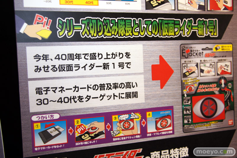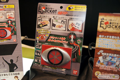 「東京おもちゃショー2011」のバンダイブースで、タッチ後にキャラクターのセリフや効果音が鳴るICカードホルダー「電子マネー Ejacket」のサンプルが展示。仮面ライダー新1号のほか、ワンピース、けいおん!などから計5種がラインナップ。