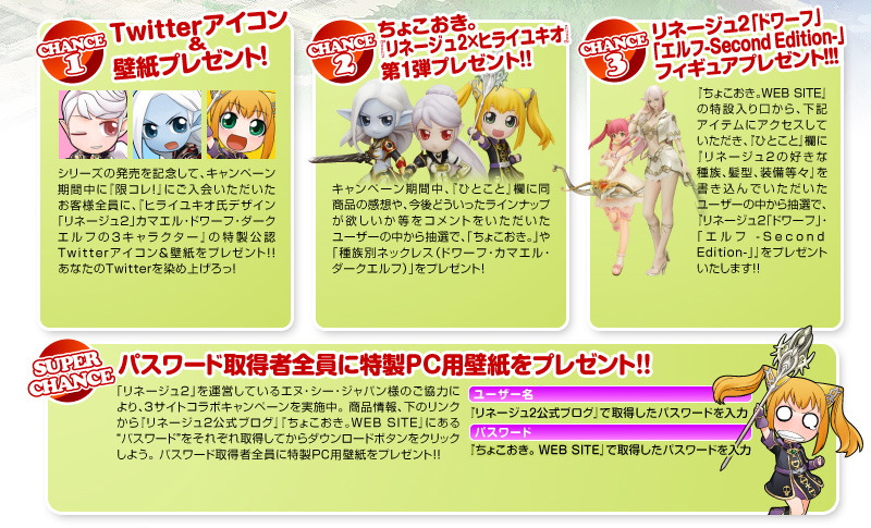 今回はコレだけでは終わらないっ!『リネージュ2』のエヌ・シー・ジャパン様ご協力のもと、3サイトコラボキャンペーンを実施中。『リネージュ2公式ブログ』『ちょこおき。Web』にある”パスワード”をそれぞれ取得してからダウンロードボタンをクリックしよう。パスワード取得者全員に特製PC用壁紙をプレゼント!!