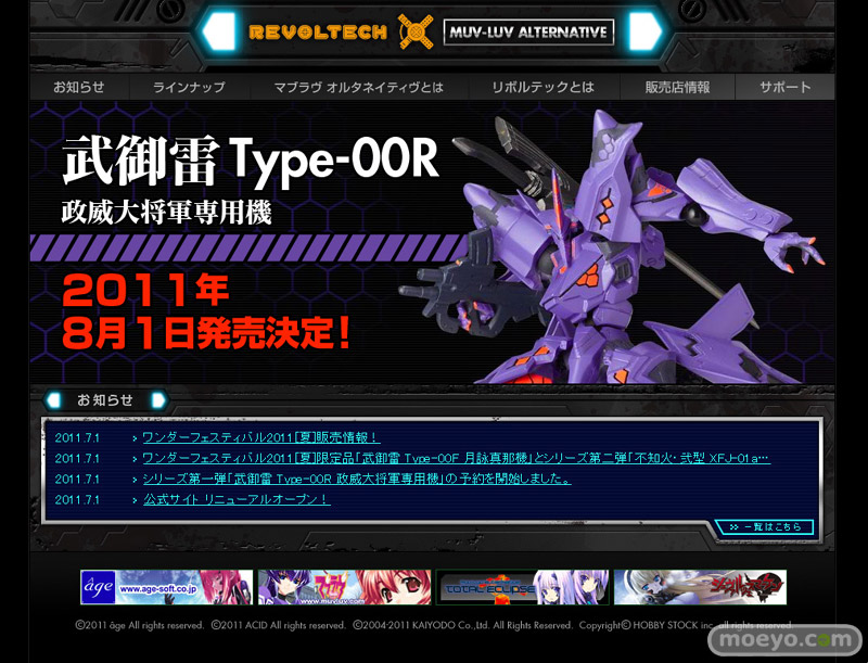 7月1日より、リボルテック マブラヴ オルタネイティヴ公式サイトにワンダーフェスティバル2011[夏]限定販売商品「武御雷 Type-00F 月詠真那機」とシリーズ第2弾「不知火・弐型」の情報を追加します。是非ご覧ください。