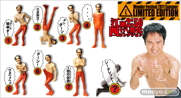 ■ 商品名:「江頭2:50 四十八変化コレクションWF限定版」 ■ 発売元:ダイブ ■ 仕様:トレーディングフィギュア ■ サイズ:各全高約80mm ■ 価格:1BOX12個入り 税込7,560円 ■ 発売:2011年7月24日(ワンダーフェスティバル 2011[夏]) |