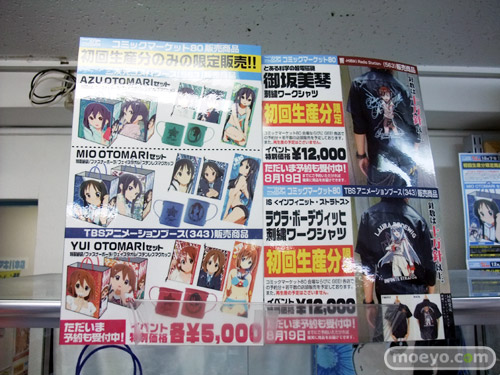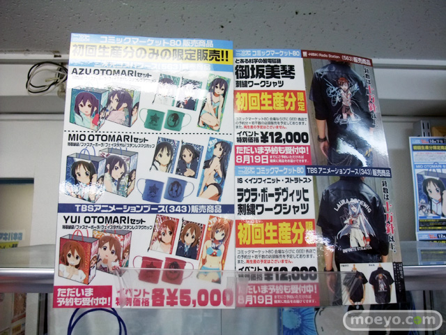 2011年8月12日~14日開催の「コミックマーケット80」で販売される、「けいおん!!MIO OTOMARIセット」「IS ラウラ/とある科学の超電磁砲 美琴」の刺繍ワークシャツ等、コスパの一部商品が、アキバの二次元コスパでサンプル展示開始。