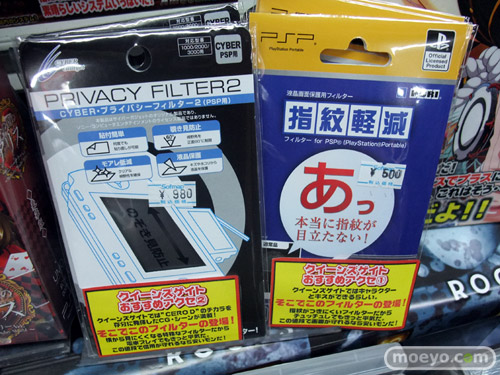 PSP「クイーンズゲイト スパイラルカオス」が発売。ソフマAM館では、キャラと画面越しにキスしてもきっと平気そうな指紋がつきにくいものと、電車プレイでも安心?の横見防止のフィルター2種が、オススメアクセとして一緒におかれてました。