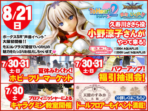 「To Heart2」久寿川ささら役小野涼子さんをお招きしての企画や、ホビーフリーマーケット、福引抽選会、キャラグミン教室などなど…。ホビー系、スケール系、ドール系さまざまなジャンルのイベントをご用意! 今年の夏、大阪ショールームは一味違います! 新たな楽しさを発見できるはず!
