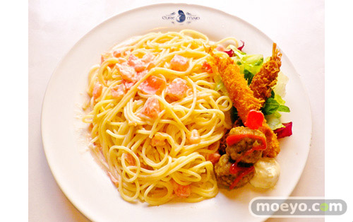 エビフライや、肉ダンゴ、サラダを添えた冷製パスタです。