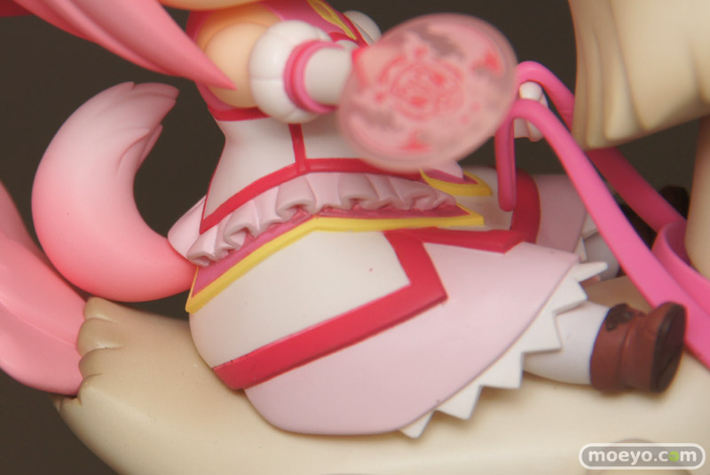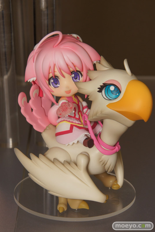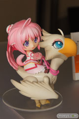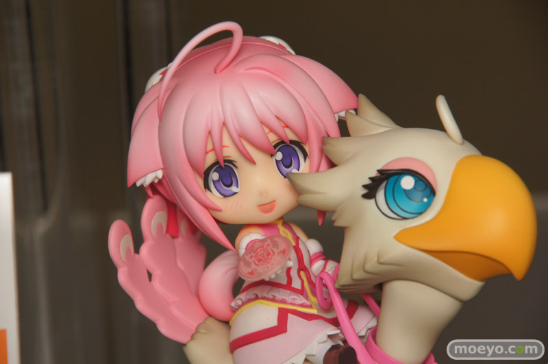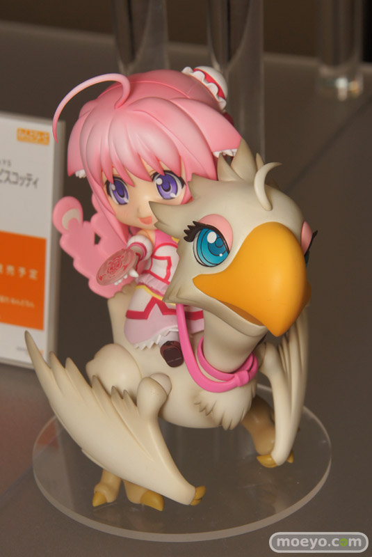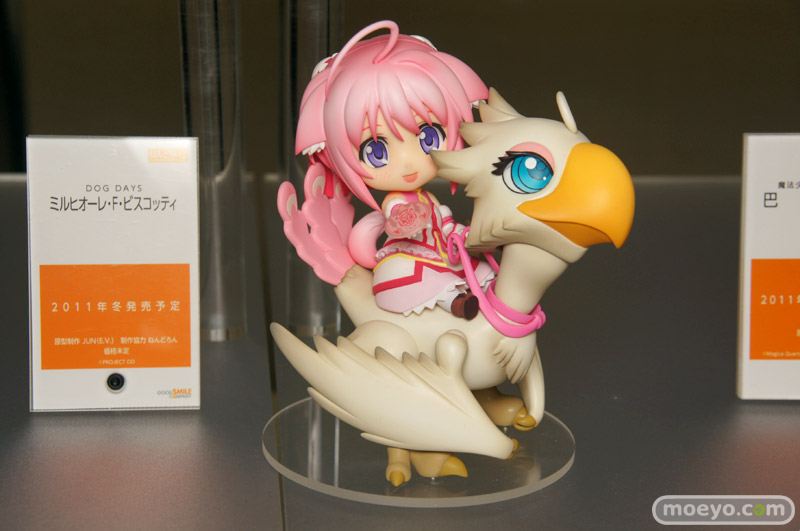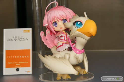 「2011夏 ホビーメーカー合同商品展示会」の会場で、先日予約が開始したGSC「DOGDAYS ねんどろいど ミルヒオーレ・F・ビスコッティ」のサンプルが展示。巨大な翼を持つセルクル「ハーラン」も付属し、乗っかることも可能です。