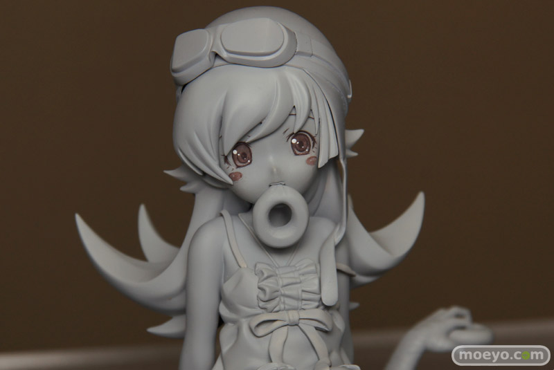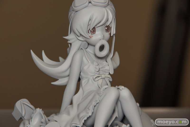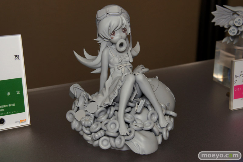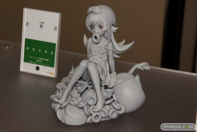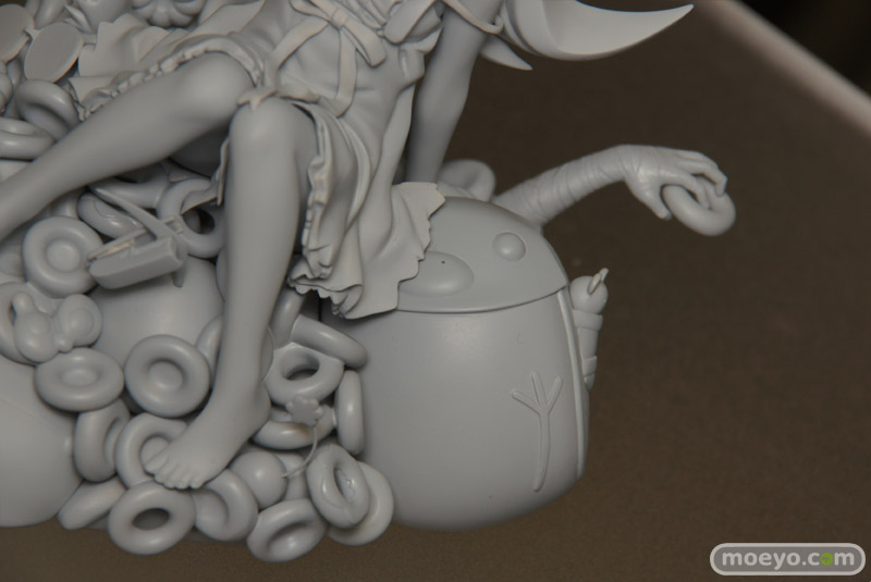 「2011夏 ホビーメーカー合同商品展示会」の会場で、グッドスマイルカンパニー「化物語 忍野忍」の未彩色サンプルが展示。DVD6巻のジャケットイラストを再現したもので、大量のドーナツや、各キャラの「チラ見せ」などもしっかりと再現しています。