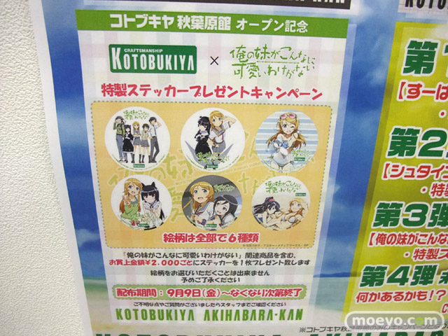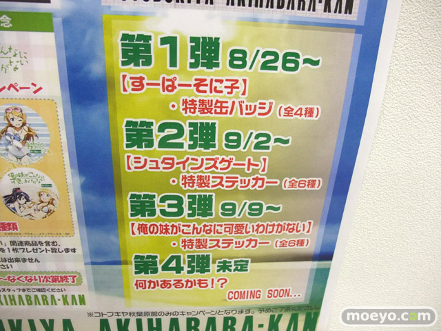 コトブキヤ秋葉原館で、3週連続プレゼントキャンペーンが本日よりスタート。第1弾は「すーぱーそに子 缶バッジ」で、第2弾「シュタインズゲート 特製ステッカー」、第3弾「俺の妹がこんなに可愛いわけがない 特製ステッカー」と続くようです。