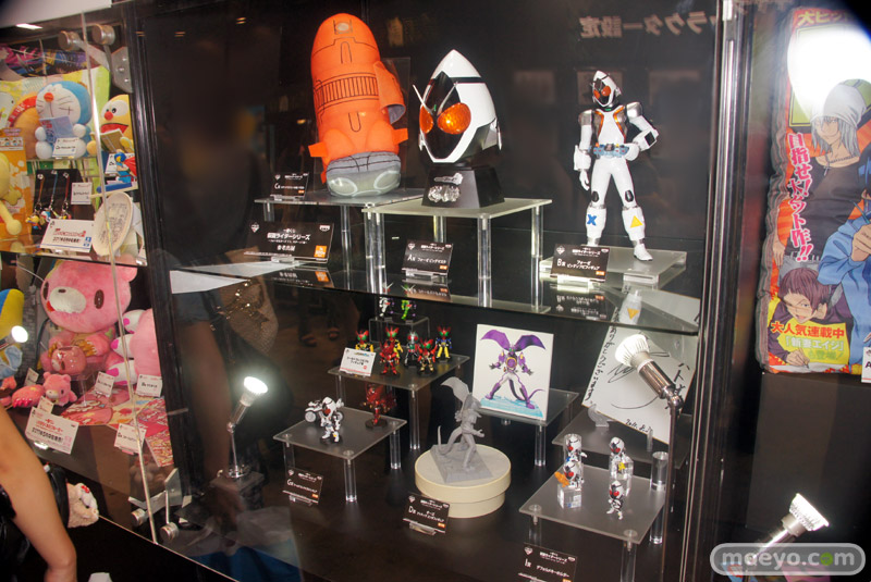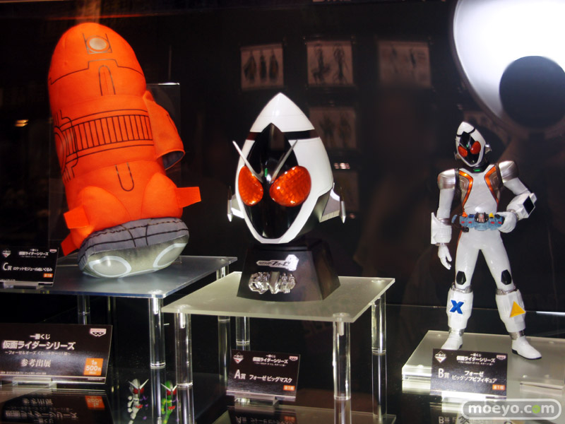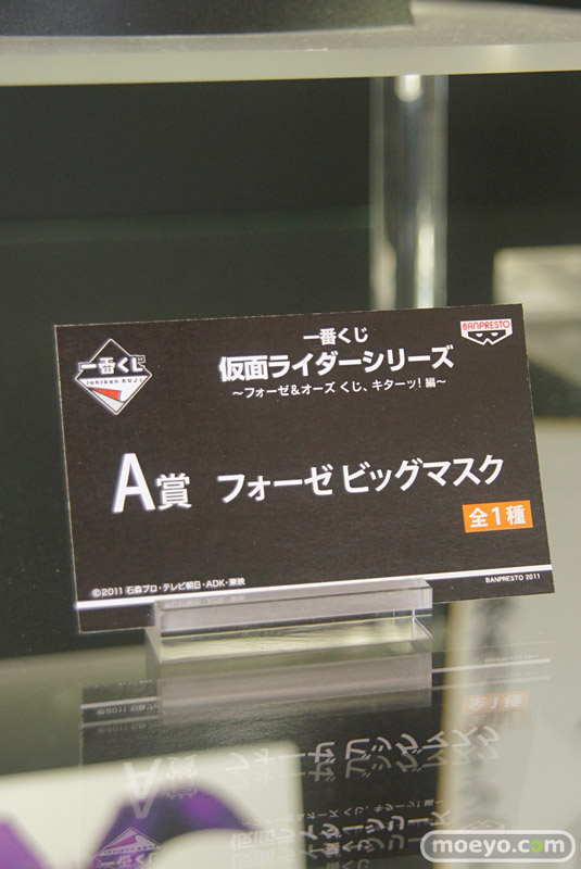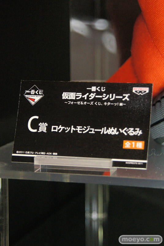 「キャラホビ2011」の会場で、バンプレスト「一番くじ 仮面ライダーシリーズ ~フォーゼ&オーズ、キターッ!編~」のサンプルが展示。「フォーゼ ビッグマスク」や「ロケットモジュールぬいぐるみ」等、インパクトバツグンの商品郡でした。