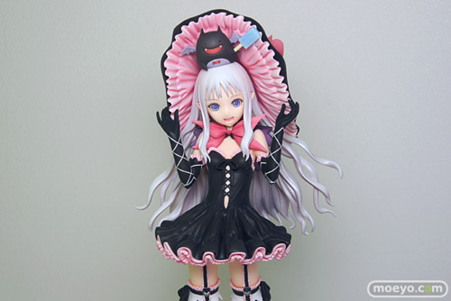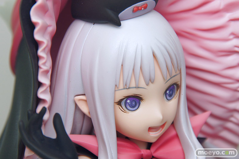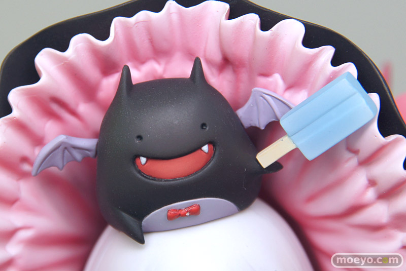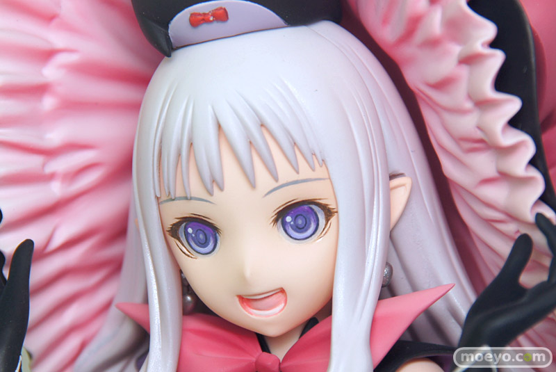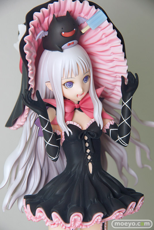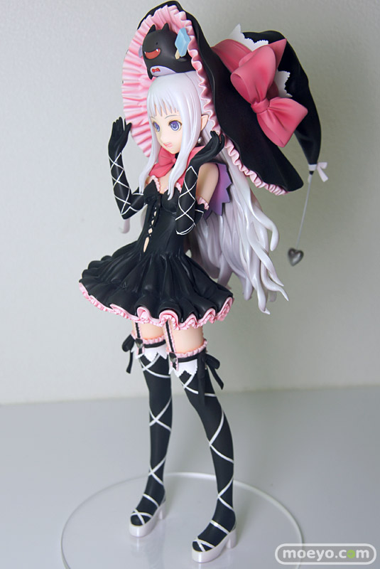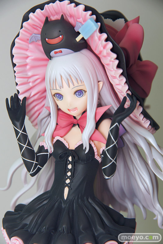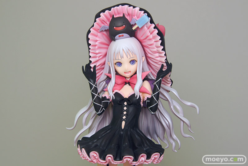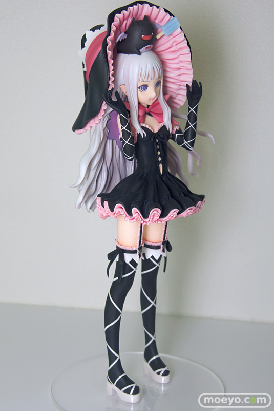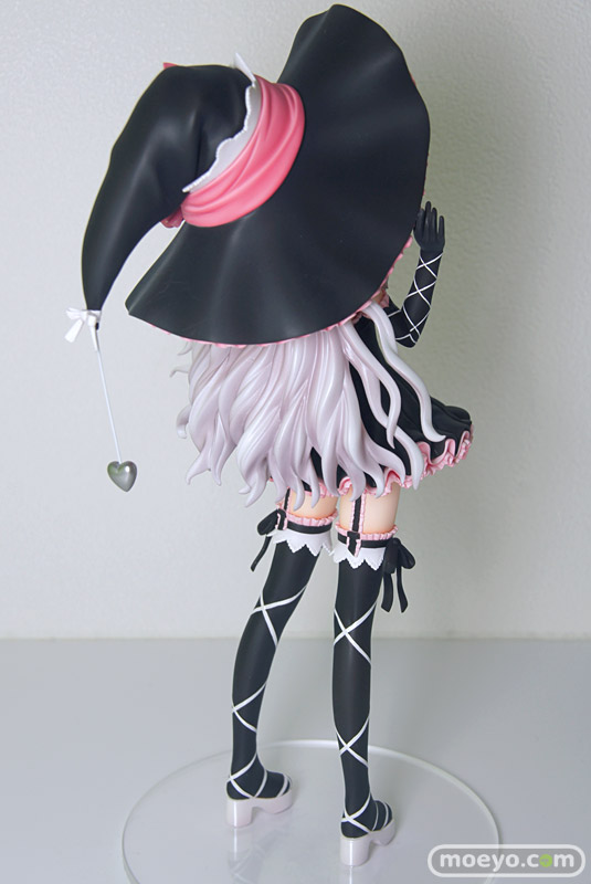 立体的な情報量が数多く盛り込まれたピンクのフリフリも可愛らしい黒ドレス、大きなマジカルハット、愛らしくデレた表情や髪の流れ、頭にちょこんと乗った使い魔のソルベエのユルくてカワイイ姿などがイラストそのままに再現され、おとなしいポーズでありながらも、存在感あふれる造形になっています。