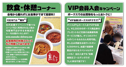 会場から離れずにお食事ができて超便利! イベント会場にてお食事用休憩スペースをご用意! 会場では定められた規則をお守りいただきますようお願いいたします。その他、ボークスでのお買い物がもっとおトクになるVS会員、VIP会員様の入会窓口も設置しております。抽選で豪華景品が当たる入会キャンペーンも!