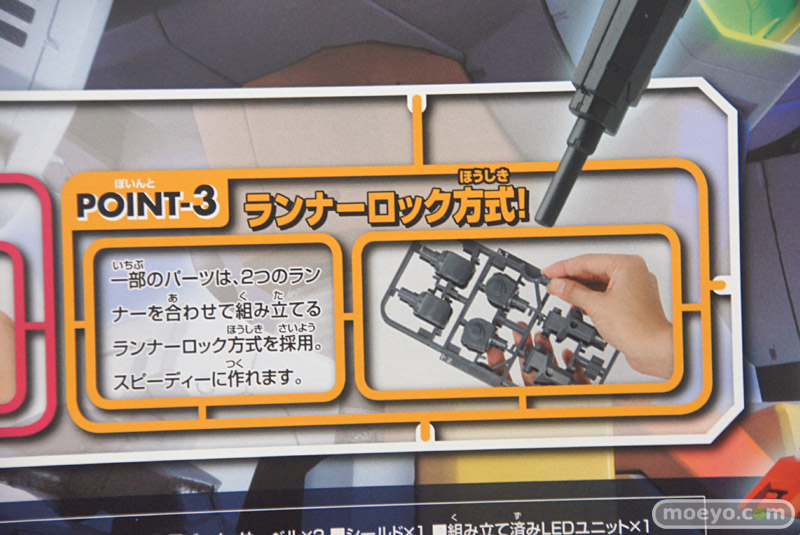 3:「ランナーロック方式!」。一部のパーツは、2つのランナーを合わせて組み立てるランナーロック方式を採用。スピーディーに作れる。