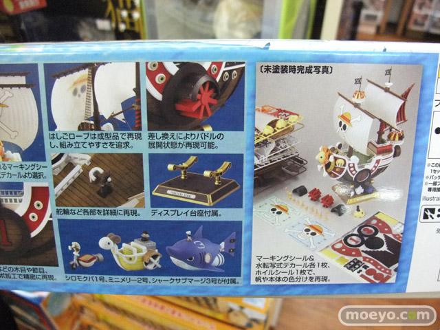 麦わらの一味の海賊船、「サウザンド・サニー号」が新世界編Ver.となって出航!! POINT1:「ソルジャードッグシステムの再現」パドルの展開もちろん、サニー号の航海を補助する3つのメカ(シロモクバ1号、ミニメリー2号、シャークサブマージ3号)が付属。3つのメカは母船と一緒にディスプレイできる。POINT2:「ガオン砲の再現」ライオンのピークヘッド(船首)より砲塔が展開するガオン砲を差し替えパーツで再現。ルフィが感動のあまりに号泣した、サニー号最強武器は必見! POINT3:「麦わらの一味」を新世界編の成長した姿でフィギュア化!! 【付属品】フィギュア×9(ルフィ、ナミ、ゾロ、ウソップ、サンジ、チョッパー、ロビン、フランキー、ブルック)、シロモクバ1号、ミニメリー2号、シャークサブマージ3号、パドル×2、ガオン砲、木×5(みかんの木×3含む)、ディスプレイベース、組立説明書