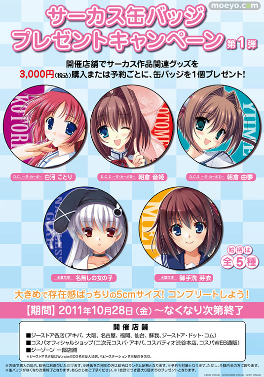 来春に「D.C.III~ダ・カーポIII~」の発売も控えている、美少女ゲームブランド「サーカス」の缶バッジプレゼントキャンペーンが開催決定!ジーストア、コスパオフィシャルショップ他でサーカス作品関連グッズ3,000円(税込)ご購入またはご予約毎に缶バッジが1個もらえます!!