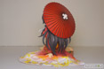 足首に捲かれた飾り紐や和の風情漂う傘などの小物も細部まで制作。