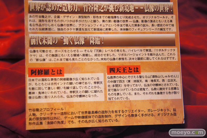 日本を代表する造形作家竹谷隆之氏総指揮のもと展開する、リボルテック新シリーズの「可動仏像フィギュア」となる、「リボルテックタケヤ」5種の彩色サンプルが、「リボルテックミーティング&ガレージキット30年史」の会場で公開。