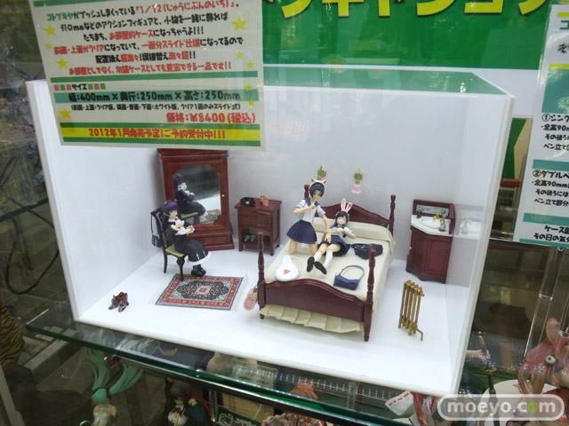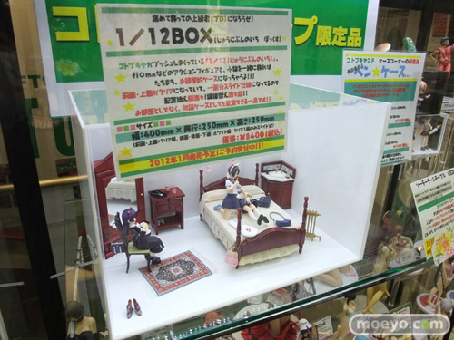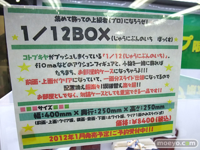 「1/12 BOX」 集めて飾っての上級者(プロ)になろうぜ! 1/12 BOX(じゅうにぶんのいち ぼっくす) コトブキヤがプッシュしまくっている「1/12(じゅうにぶんのいち)」。 fi○maなどのアクションフィギュアと、小物を一緒に飾れば たちまち、お部屋的ケースになっちゃうよ!!! 前面・上面がクリアになっていて、一面分スライド仕様になってるので 配置換え超楽々!模様替え超楽々!! お部屋としてでなく、勿論ケースとしても重宝できる一品です!! 中にはfigmaと小物を組み合わせた使用例も展示 化粧台などはもちろん、ベッドなどやや大きめなものも飾れるようです この大きさなら、背景を工夫して、例えばけいおん!の5人のライブ会場風に仕立てたり、バーナビーの自室を再現、なんてことも可能かも? アクリルなので価格は貼りますが、取って置きのアイテムを飾るケースとしては、かなり使い勝手がよさそうでした! 以前お伝えした、「シングルペン☆ケース/ダブルペン☆ケース」や、「esシリーズ5周年記念 ミニフィギュア専用ケース」といい、やはりフィギュアメーカーが考えるケースは面白いものが多いですね! 発売は、2012年1月予定となっています。 ■ 商品名:「1/12 BOX」 ■ 仕様: 全面・上面:クリア板 横面・背面・下面:ホワイト板 クリア1面のみスライド式 ■ サイズ:幅400mm×奥行250mm×高さ250mm ■ 価格:税込8,400円 ■ 発売:2012年1月 関連 ■ペンケースにミニフィギュアを飾る 「シングルペン☆ケース/ダブルペン☆ケース」予約開始 ■コトブキヤ秋葉原館