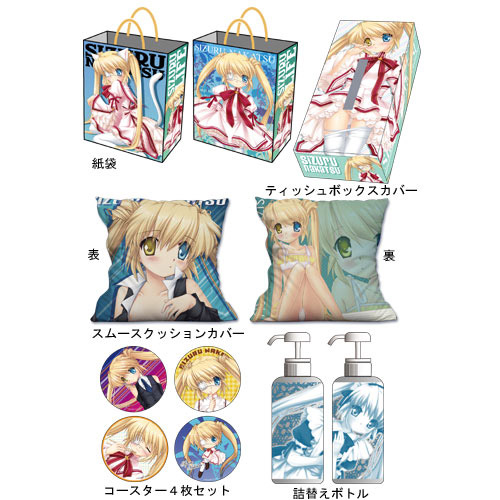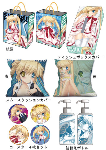 ■ 商品名:「SIZURU Lifeセット」 ■ セット内容: スムースクッションカバー(45×45cm / スムースタイプ) ティッシュボックスカバー(一般的なスリムタイプのティッシュボックスに対応) 詰替えボトル(直径75×高さ210mm / 容量650ml) コースター4枚セット(直径9cm) 特製紙袋 ■ 価格:税込5,250円 ■ 発売:2012年3月中旬 |