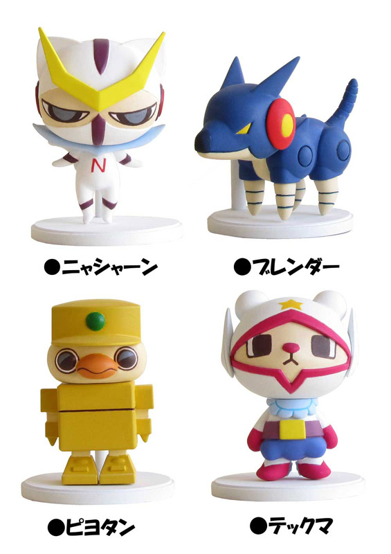 メインキャラクターは、キャシャーンとネコの「ニャシャーン」、ガッチャマンとペンギンの「ガッチャペン」、ゴールドライタンとひよこの「ピヨタン」等。