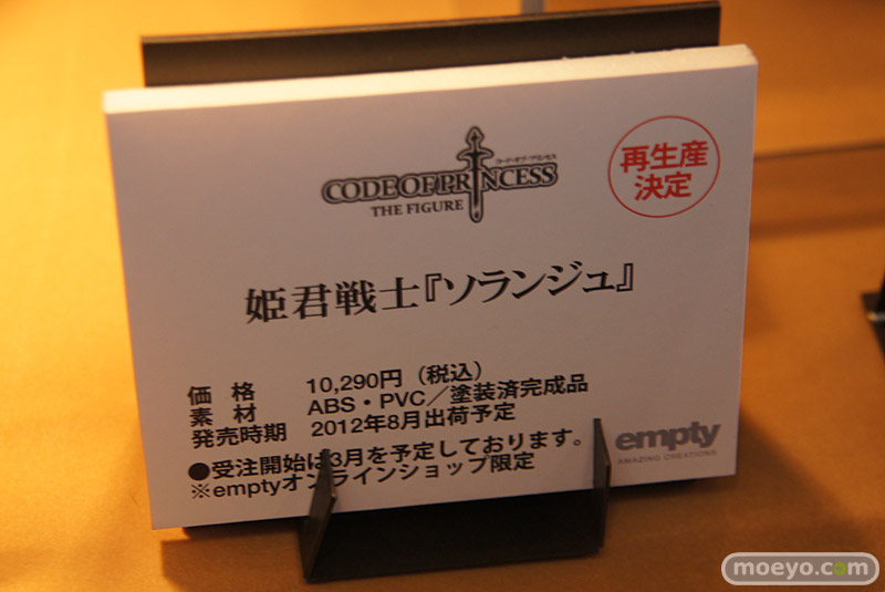 「ワンダーフェスティバル 2012[冬]」の「empty」ブースでは、ニンテンドー3DSでゲーム化も決まっている「CODE OF PRINCESS 姫君戦士 ソランジュ」の製品版サンプルが展示。3月には再生産も決定したようです。