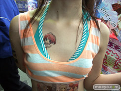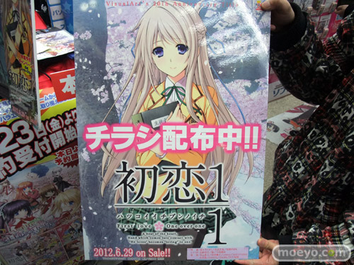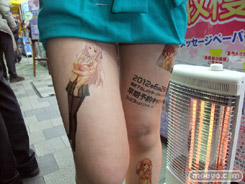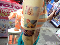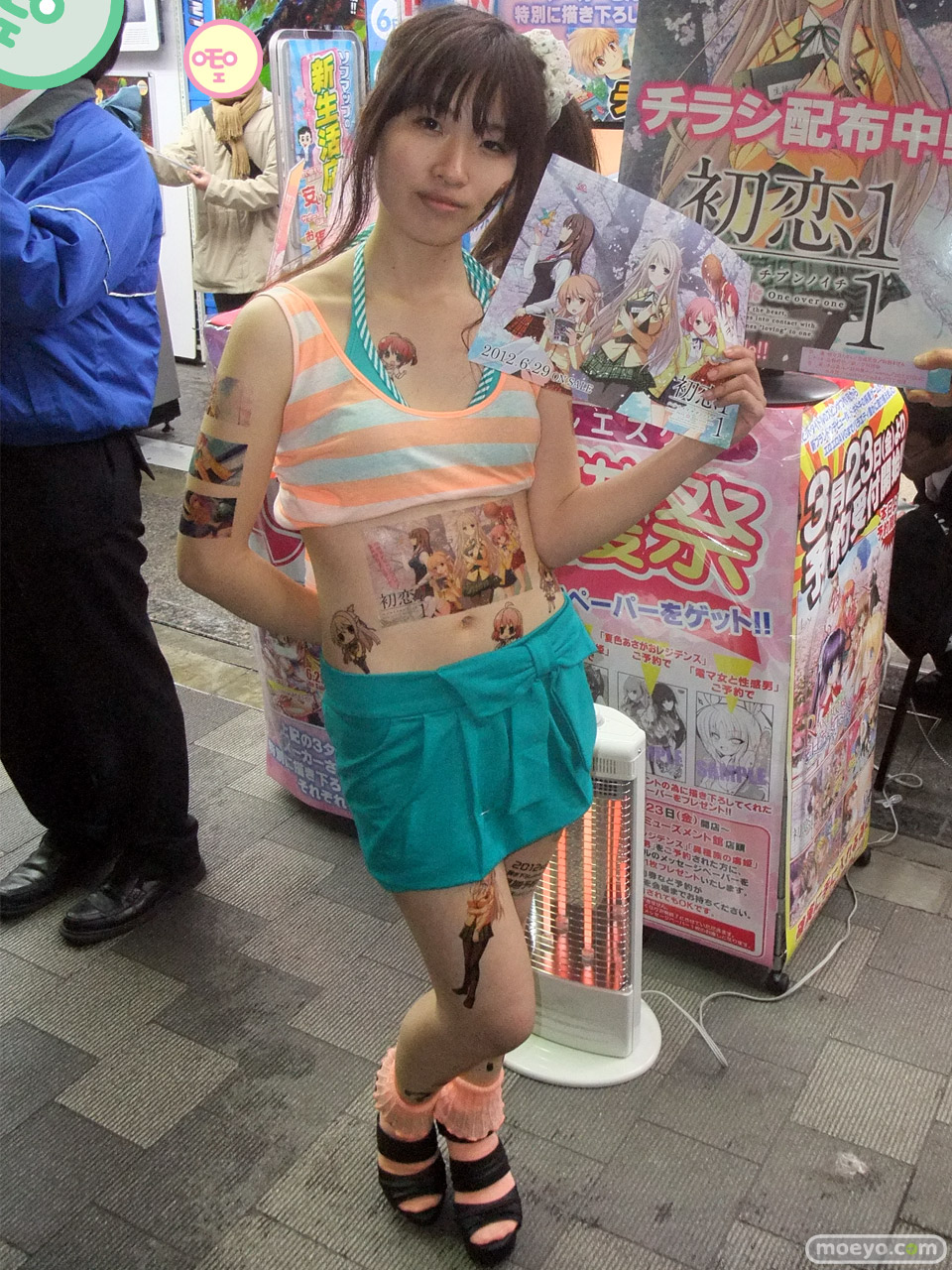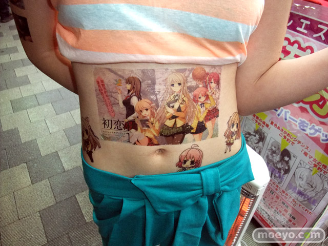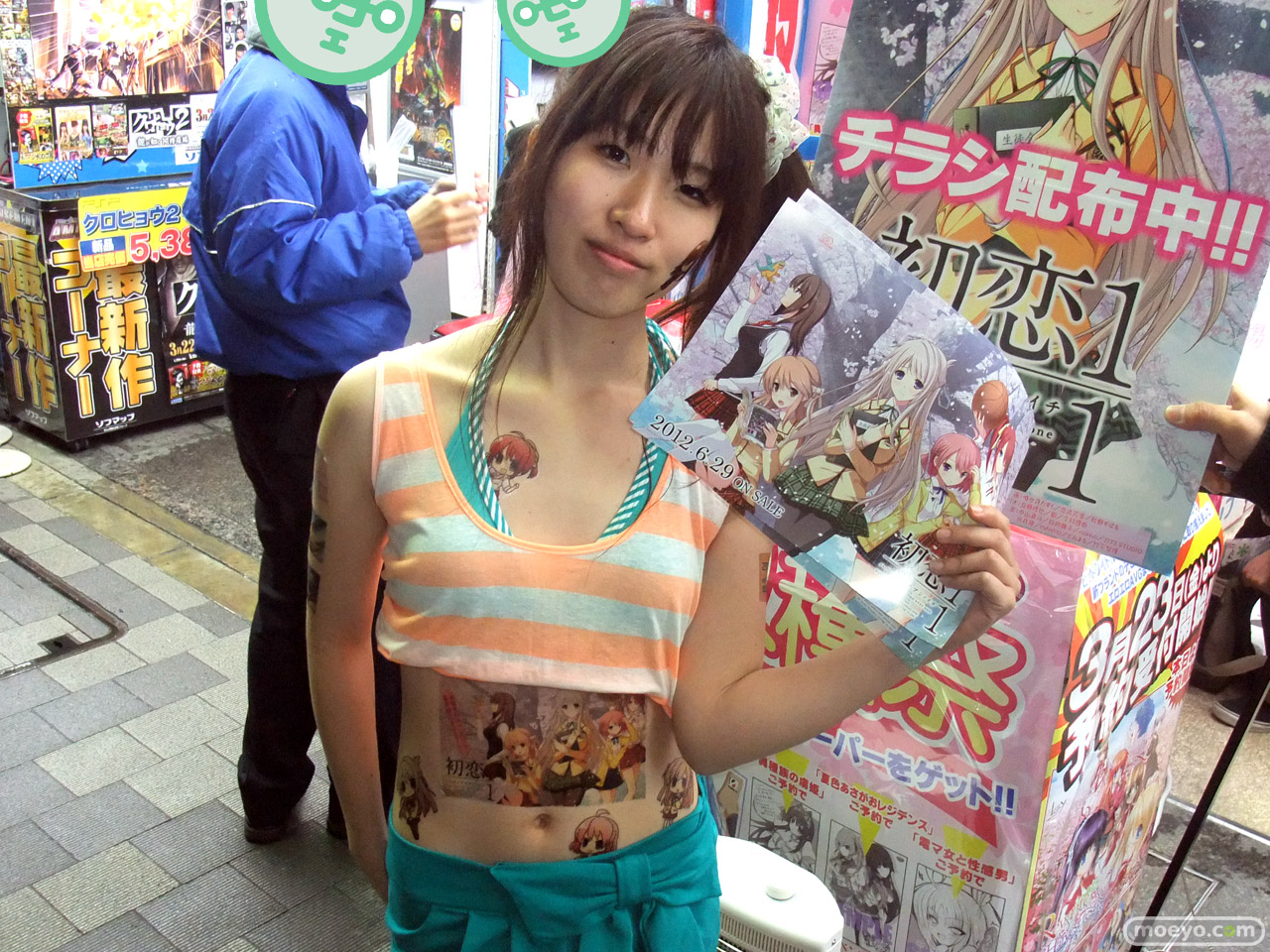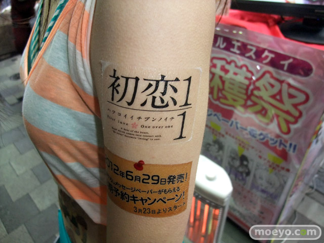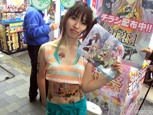 6月29日に発売予定のビジュアルアーツ20周年記念ブランド作品「初恋1/1」のアピールとして、3月23日、ソフマAM館店頭で全身「初恋1/1」イラストなどの「痛トゥー」をしたビキニおねーさんがチラシを配布していました。