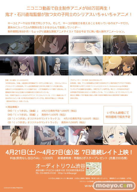 アニメーション作家の石川直哉氏が監督・脚本・アニメ制作の全工程を一人で手掛けた個人制作アニメDVD「くっつきぼし(後編)」のDVD発売記念として、4月21日より開催の1週間連続レイト上映の日程が確定しました!【プリマステア】