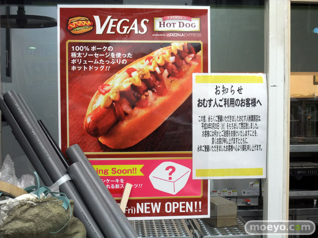 3月下旬に閉店した、ドンキ1Fの「おむす人」の跡地が、ピザーラを運営するフォーシーズ系列のお店「VEGAS PREMIUM HOT DOG(ベガスプレミアムホットドック)」になるようで、告知POPが出ていて、工事も開始していました。