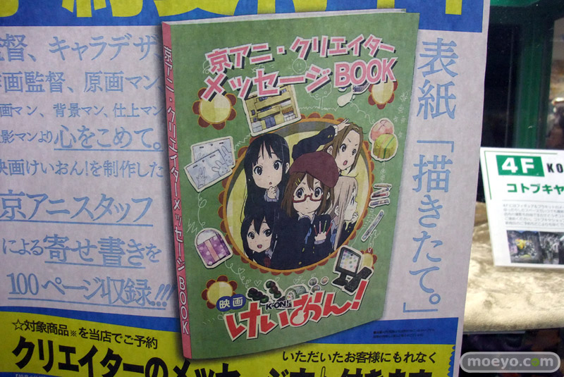 7月18日発売予定のBlu-ray/DVD「映画けいおん!」ですが、コトブキヤ秋葉原館で「京アニショップ オリジナル特典 京アニ・クリエイターメッセージBOOK付き」の予約が開始したようで、特典表紙を掲載したPOPが掲示されていました。