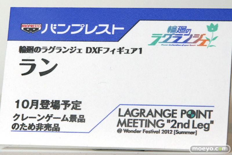 「ワンダーフェスティバル 2012[夏]」の輪廻のラグランジェブースでは、WFには不参加のバンプレストのプライズを始め、輪廻のラグランジェ関係の新作フィギュアのサンプルが展示されていました。それら展示の様子をまとめてお伝えします。