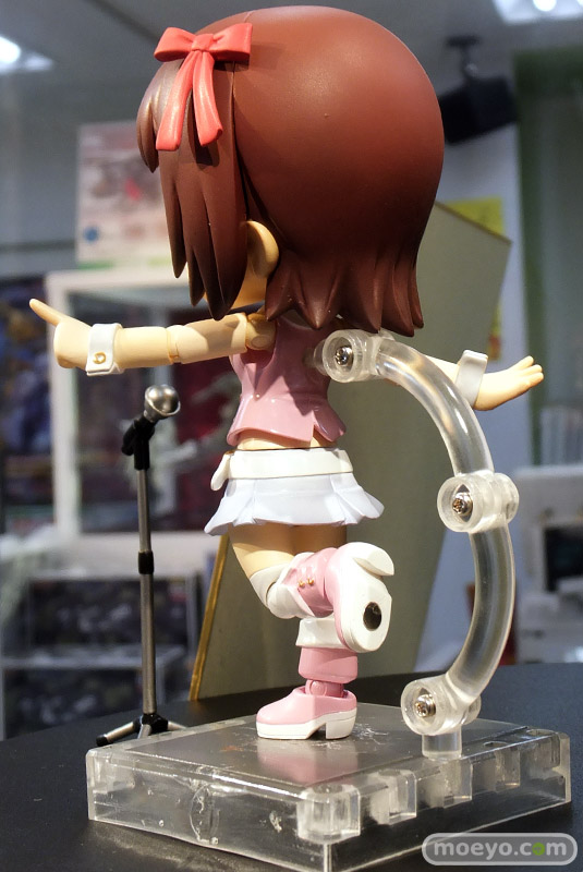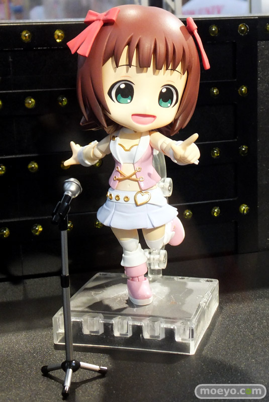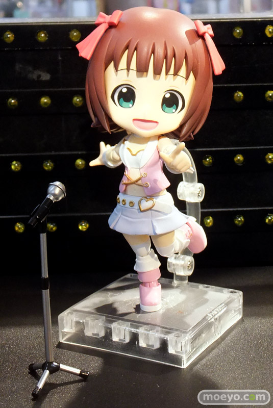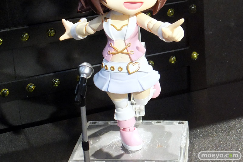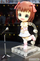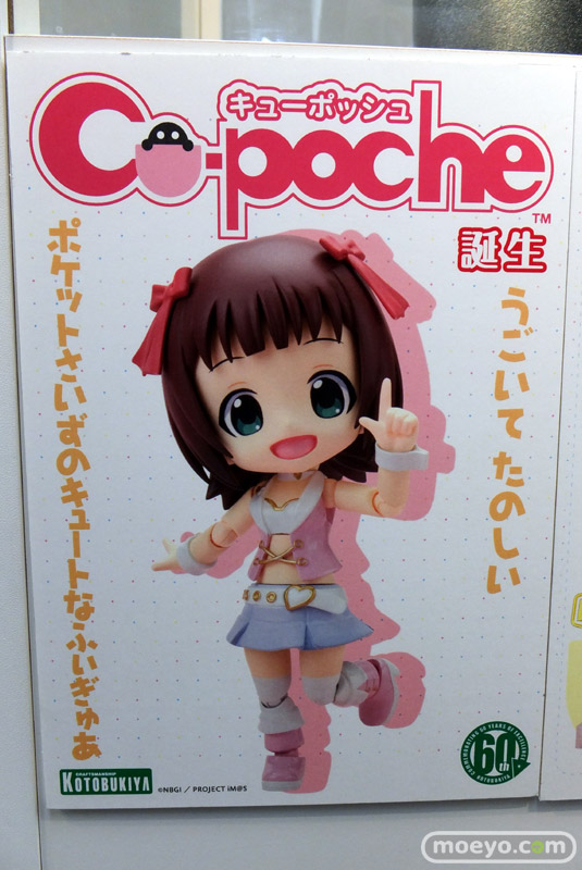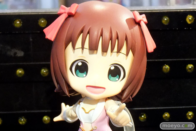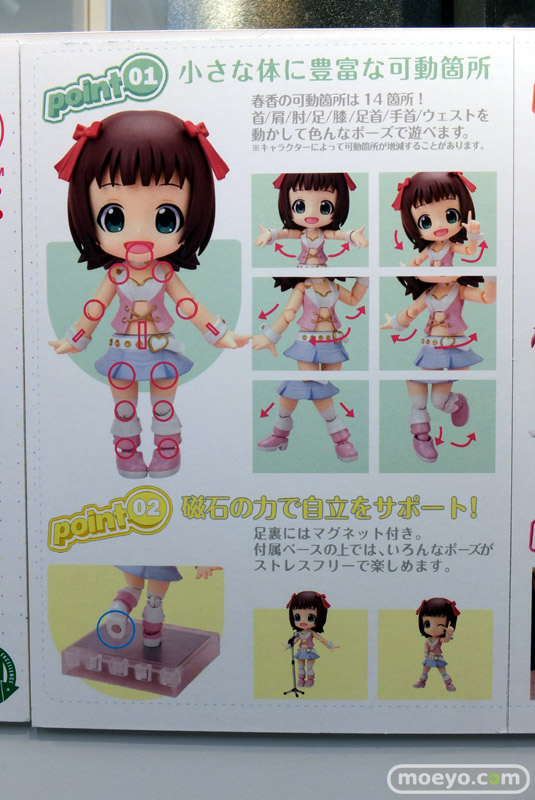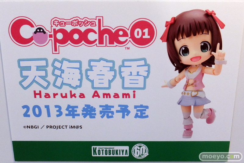 WF2012夏で初公開された、コトブキヤの新可動ディフォルメフィギュアシリーズ「キューポッシュ」の第1弾「天海春香」の彩色サンプルが、コトブキヤ秋葉原館にて展示中。14箇所可動し、台座は磁力接続。表情パーツや小物も付属するようです。
