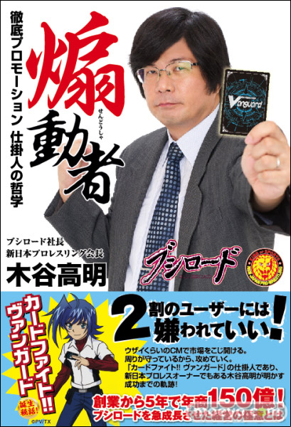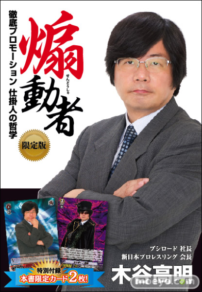カードゲーム専門誌「カードゲーマー」などを発行している株式会社ホビージャパンは、TCG(トレーディングカードゲーム)カンパニー・ブシロード社長にして新日本プロレスリング会長である木谷高明が経営の極意と自らの半生を語る自身初の著書、「煽動者 徹底プロモーション 仕掛人の哲学」を2013年1月4日(金)に発売致します。限定版には本書限定PRカード2種付属!! 出版記念イベントも開催!