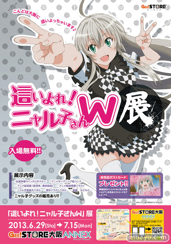 テレビ東京ほかにて絶賛放送中の『這いよれ!ニャル子さんW』!今度は大阪にも這いよっちゃいます♪ジーストア大阪ANNEXでの展覧会では、出演者のサイン入りポスターや場面カット、設定、制服などたくさんの展示をご用意。【コズパ】