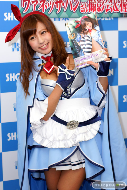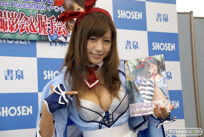 発売された写真集のアリシアの格好で現れたヴァネッサ パンちゃんは、様々なポーズで笑顔で撮影に応じていました。